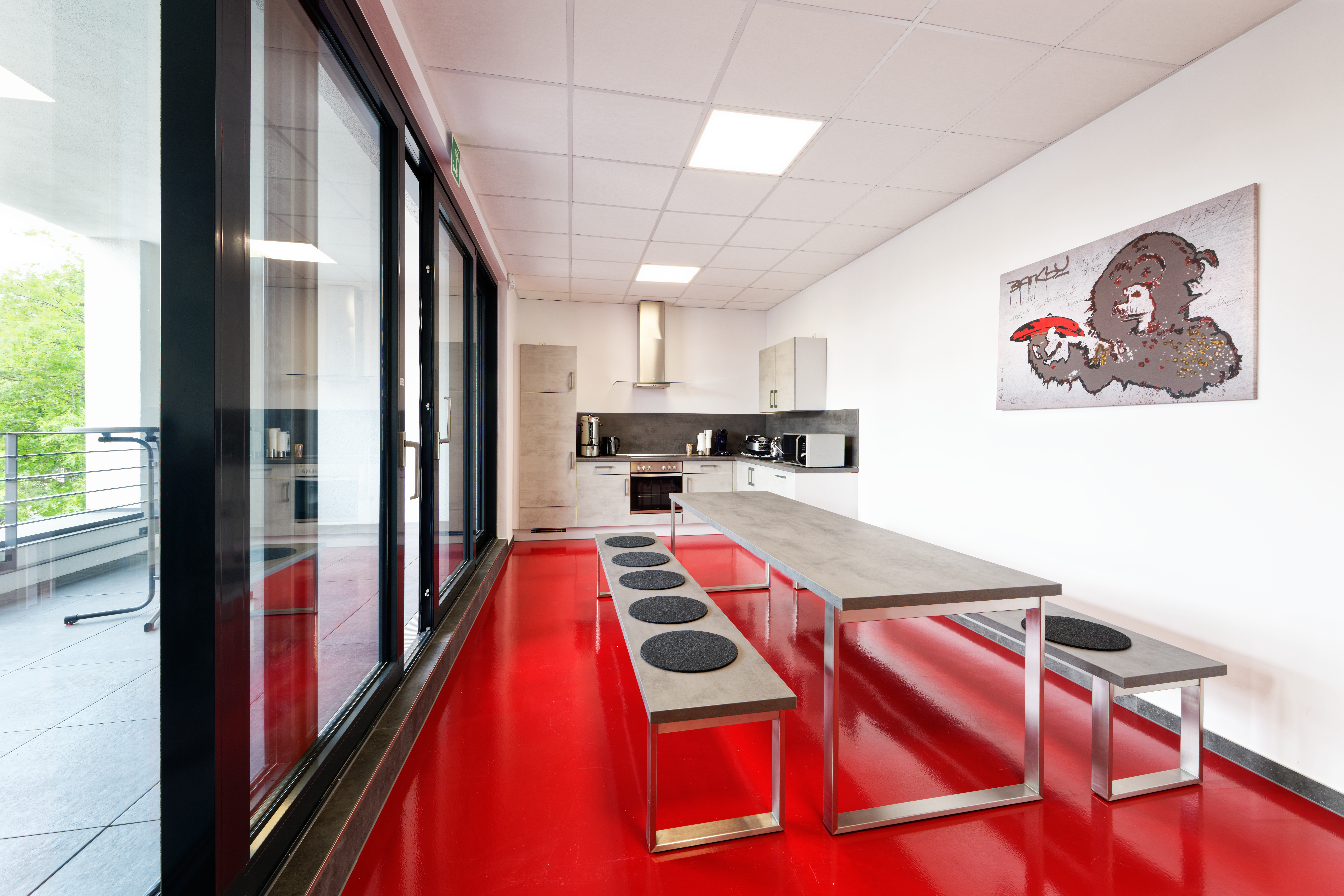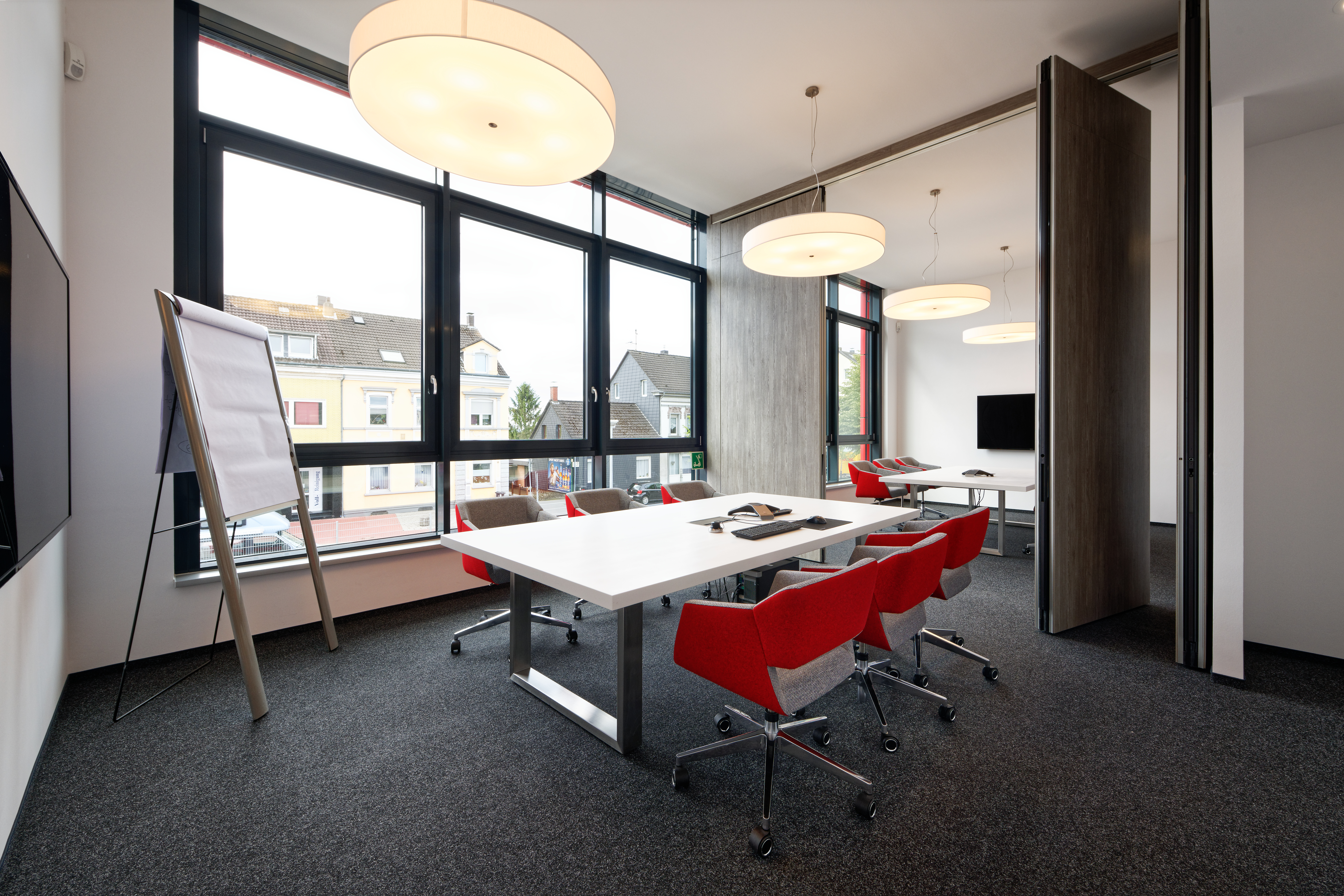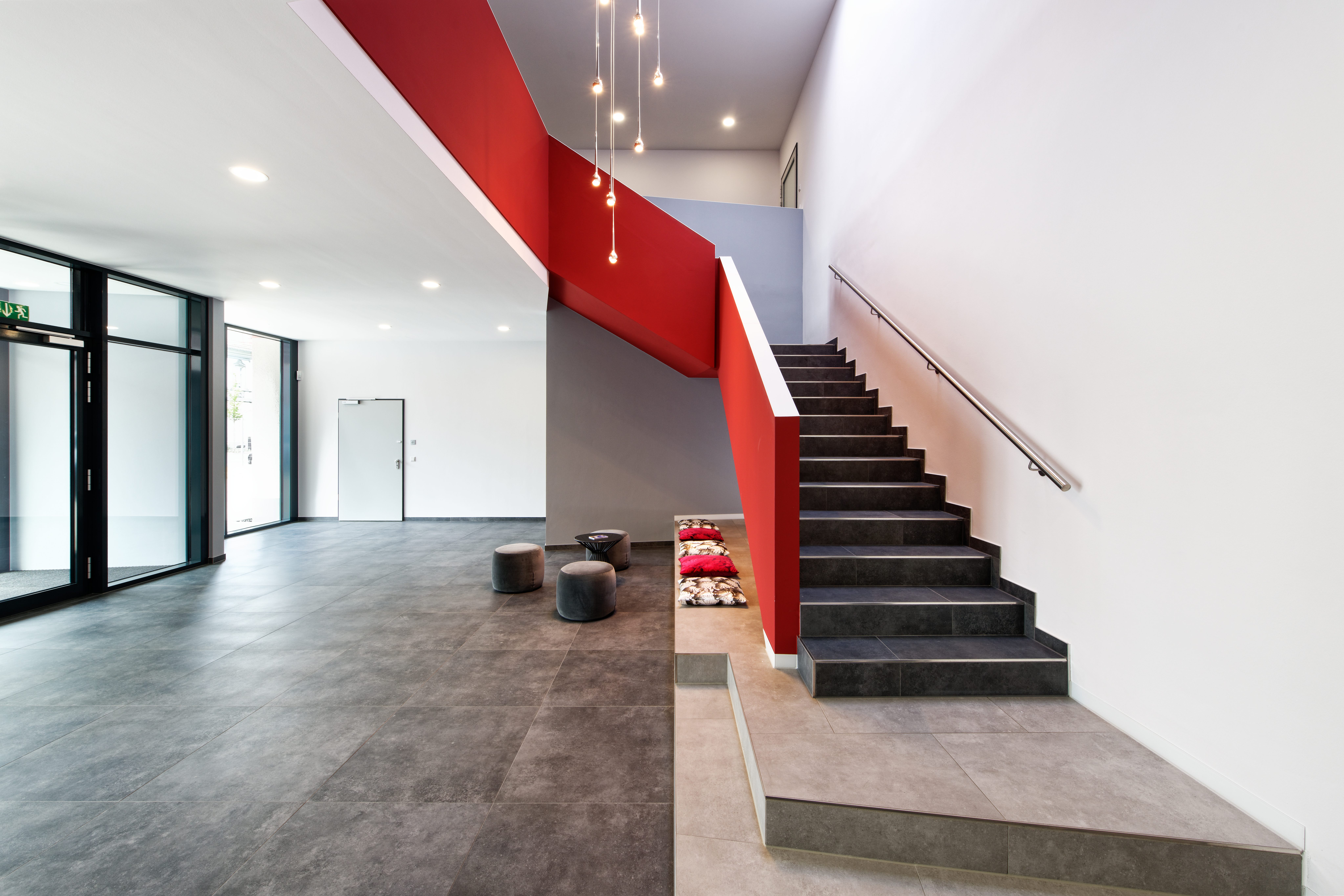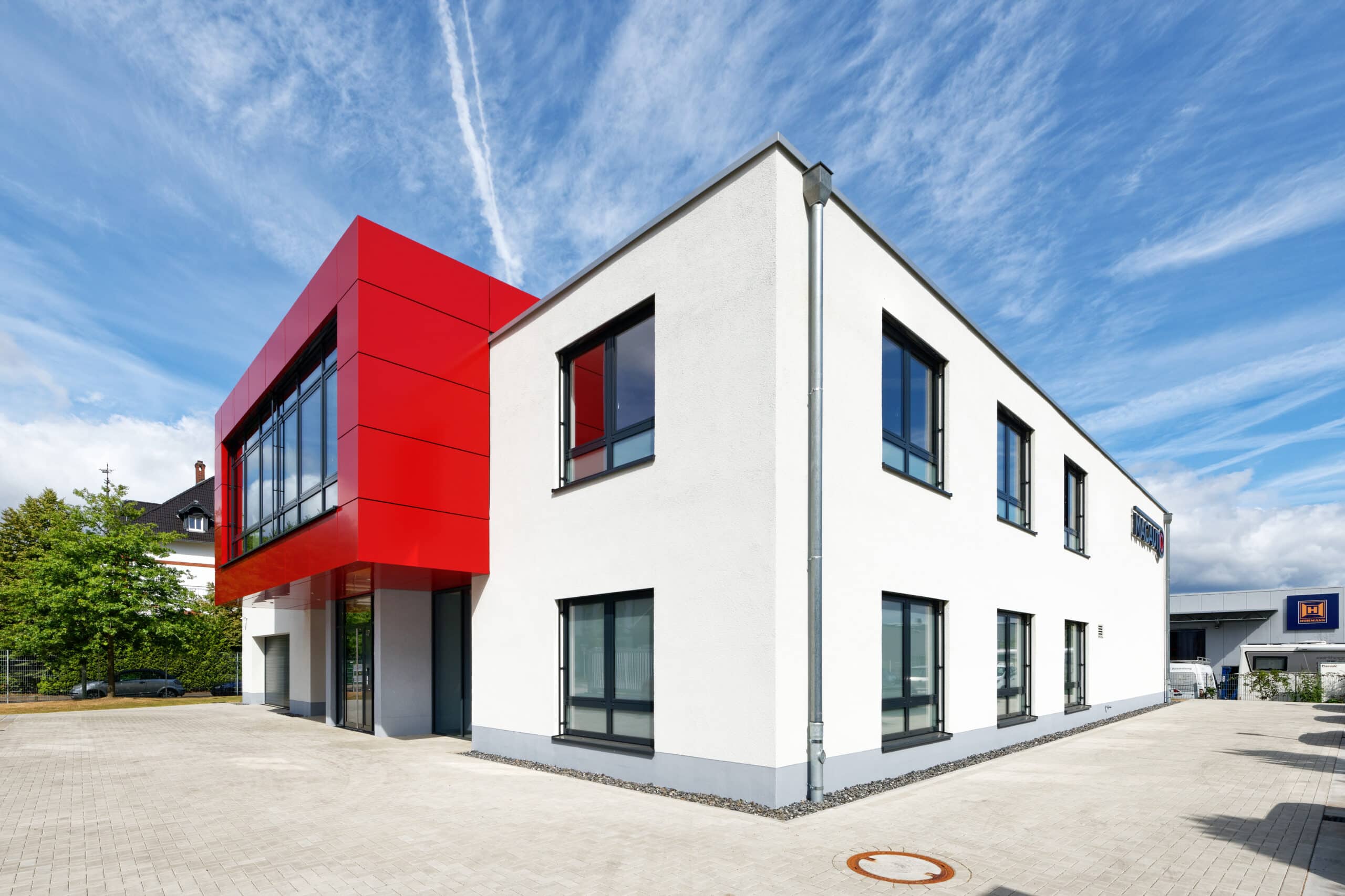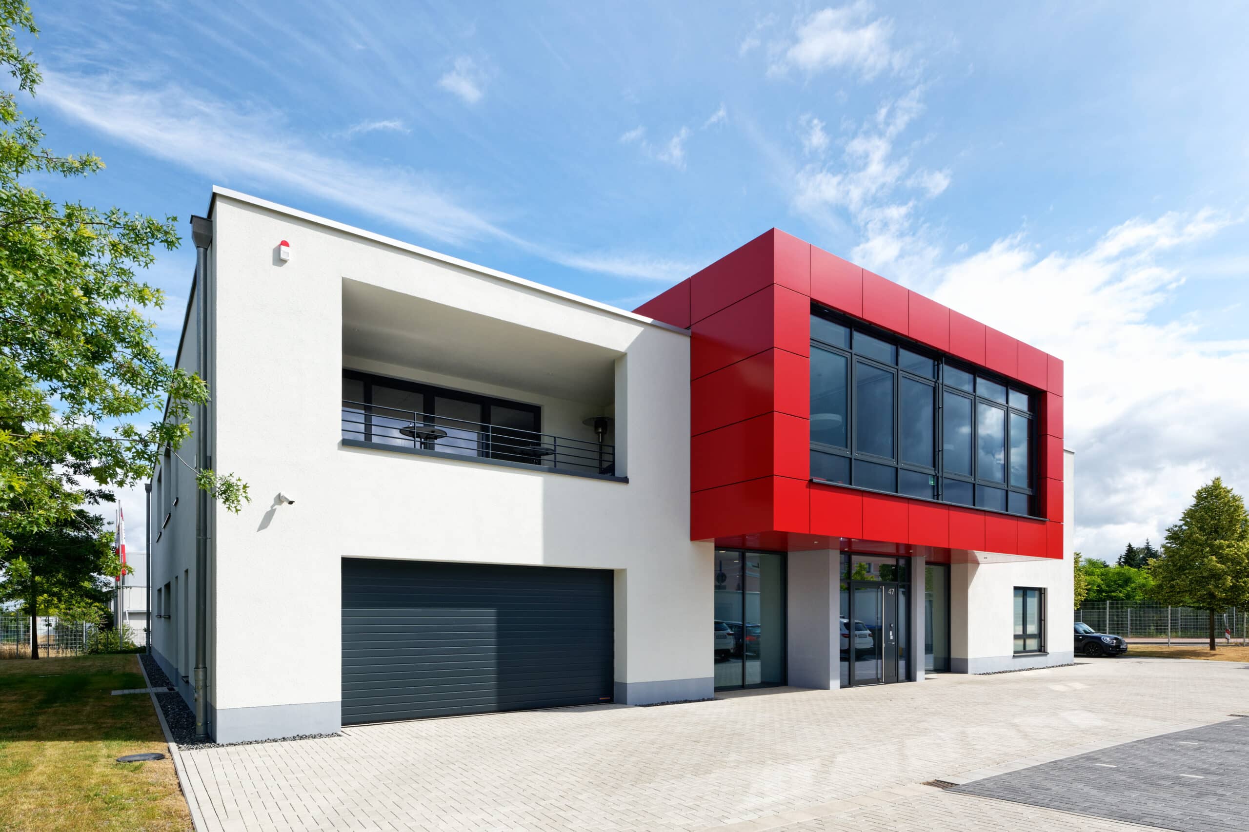 Das Flachdach wurde als energieeffizientes Folien-Warmdachsystem ausgeführt. Architektonisches Highlight ist die markante Fassadengestaltung: Ein prägnanter Baukörper mit roter Alucobond-Verkleidung setzt einen starken Akzent im Stadtbild. Ergänzt wird dies durch ein Wärmedämmverbundsystem mit Mineralwolldämmung. Thermisch getrennte Aluminiumfenster mit Isolierverglasung sorgen für Energieeffizienz und ein modernes Erscheinungsbild.
