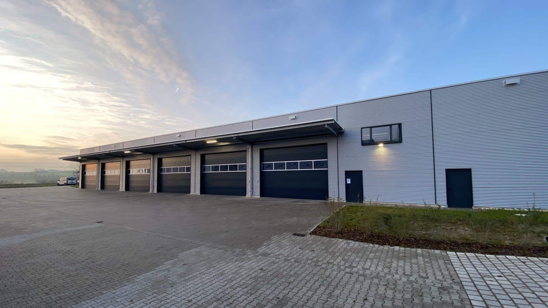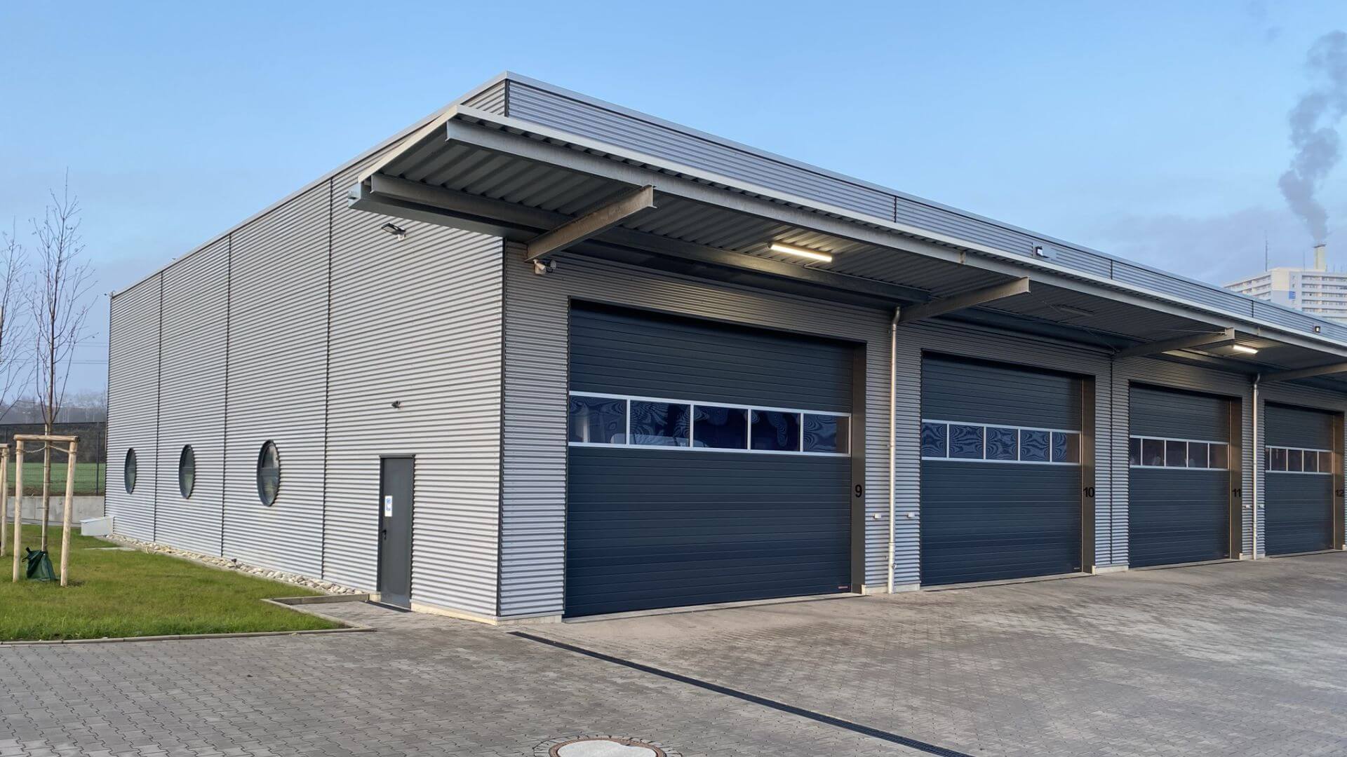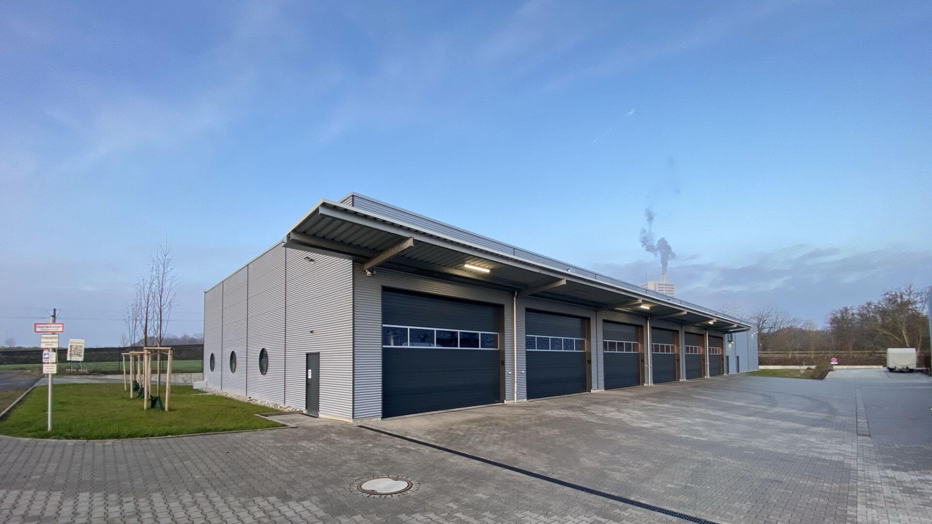 Großzügige Sektionaltore, Aluminium-Fensteranlagen sowie ein umlaufendes Vordach ermöglichen eine effiziente Nutzung im täglichen Betrieb. Die befestigten Außenflächen wurden mit Betonsteinpflaster ausgeführt und funktional in das Grundstück integriert.