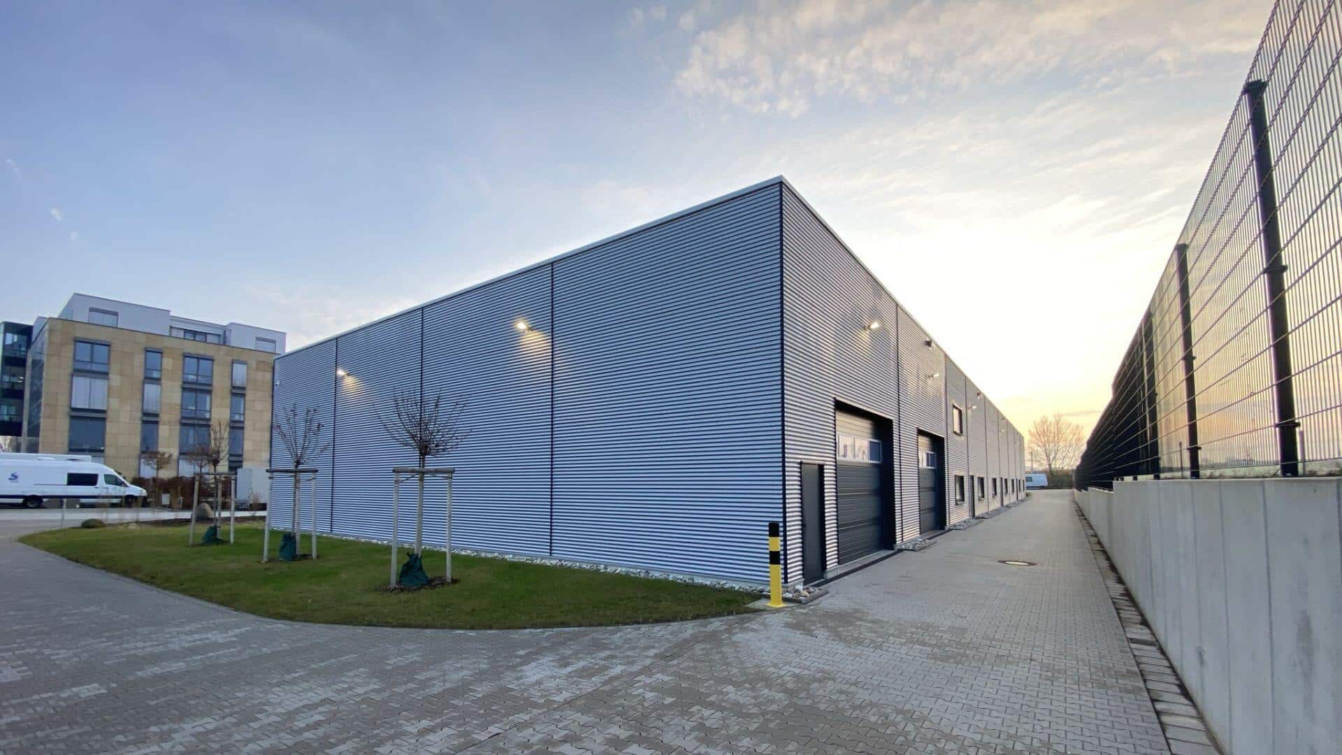 Neubau einer modernen Fahrzeug- und Lagerhalle in Mainz-Marienborn: Für Reeh & Reeh realisierte GIESERS BAU eine funktionale Stahlhalle mit hochwertiger Fassade, Warmdach, Dachbegrünung und großzügigen Verkehrsflächen.