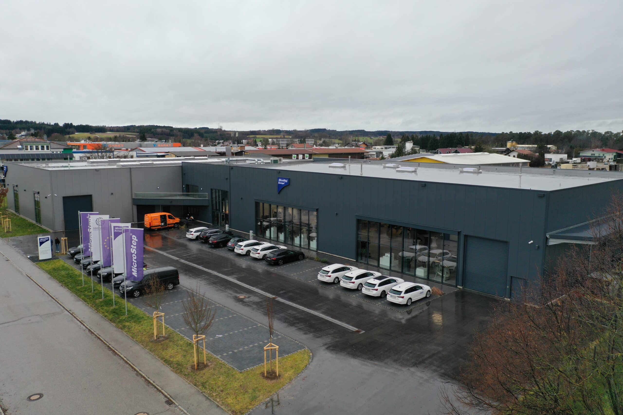 Luftaufnahme des MicroStep Competence Centers mit Büro- und Hallengebäuden in Bad Wörishofen.