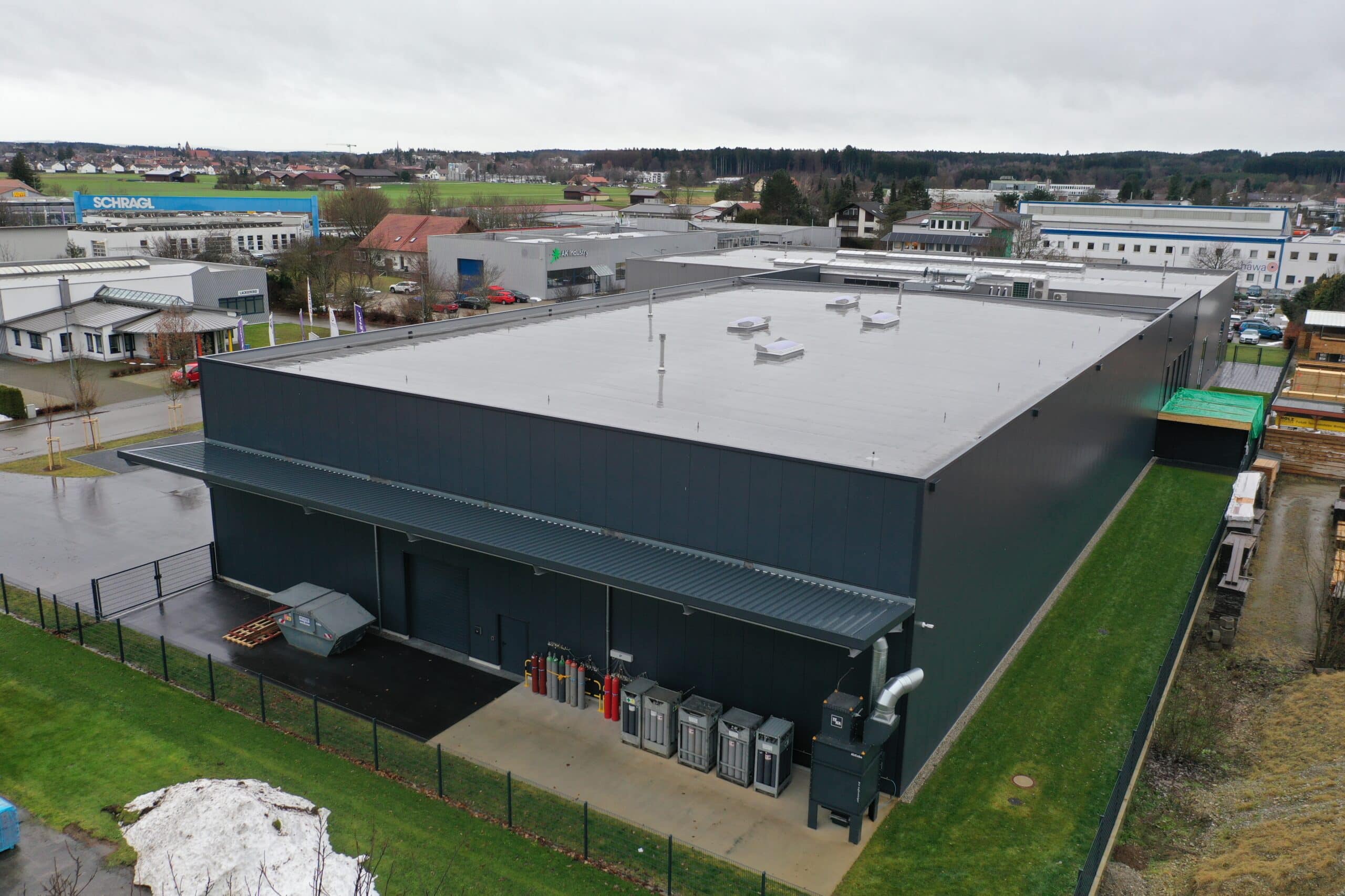 Seitliche Luftansicht des Hallenneubaus von MicroStep Europa mit begrünten Außenflächen.
