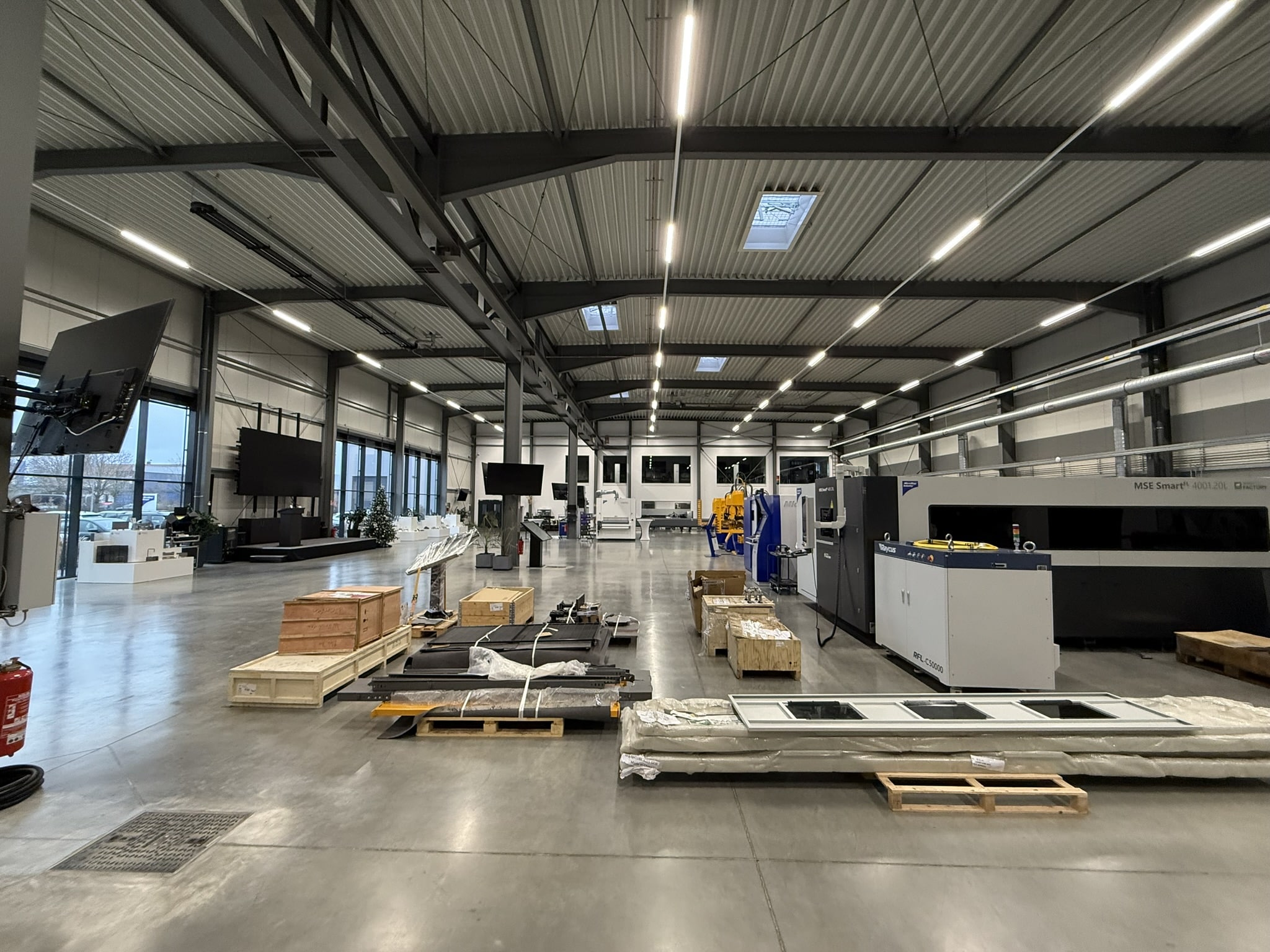 Das Vorführzentrum mit einer Länge von über 45 Metern bietet großzügige Präsentationsflächen mit integrierter Kranbahn, moderner Rauch- und Wärmeabzugsanlage sowie großflächigen Glasfassaden in Pfosten-Riegel-Konstruktion. Hier können komplexe Schneidsysteme realitätsnah vorgeführt und Schulungen durchgeführt werden.