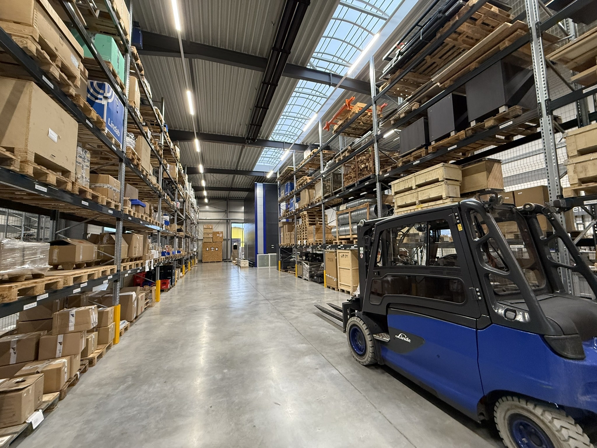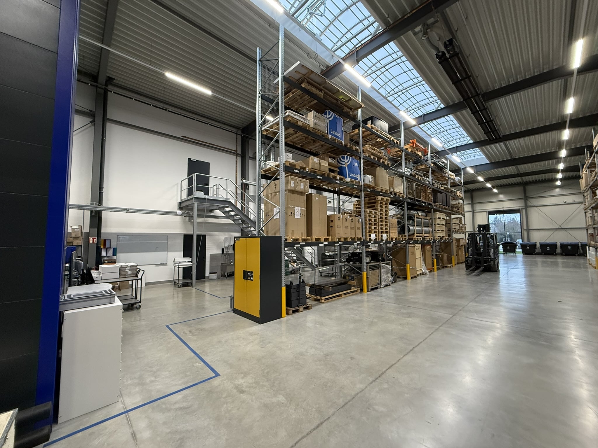 Die Logistikhalle misst rund 30 × 50 Meter bei einer Seitenhöhe von über 8 Metern. Eine hoch belastbare, stahlfaserbewehrte Bodenplatte mit Hartstoff-Verschleißschicht erlaubt den Einsatz schwerer Flurförderzeuge und Maschinen. Großformatige Sektionaltore sowie eine durchgehende Dachlichtbandlösung sorgen für optimale Logistikabläufe und natürliche Belichtung.