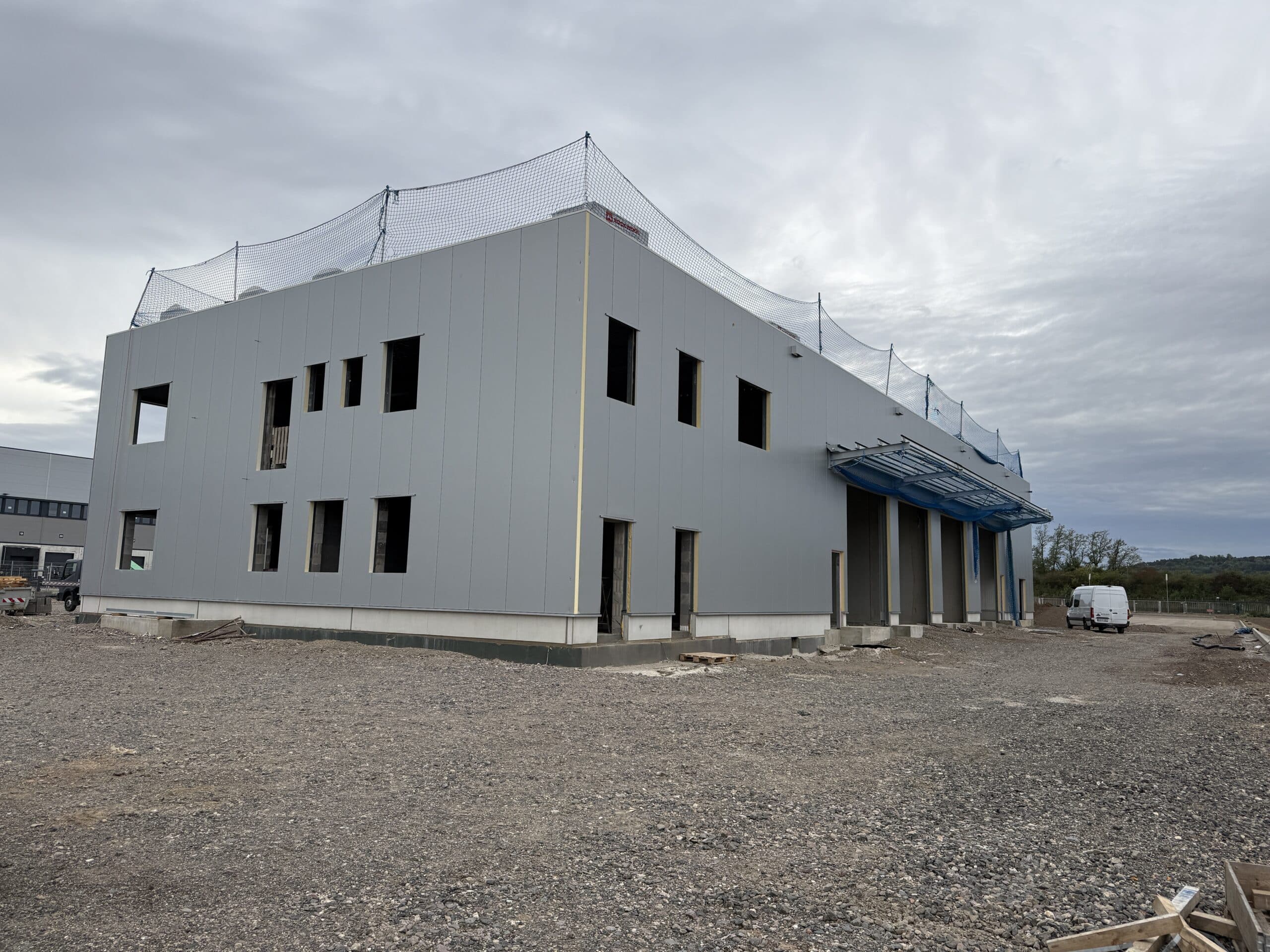 Die Gebäudehülle besteht aus energieeffizienten Sandwichpaneelen mit PUR-Dämmkern, ergänzt durch ein wärmegedämmtes Flachdach als Folien-Warmdachsystem. Großzügige Sektionaltore, Lichtbänder, Lichtkuppeln sowie Fensterflächen sorgen für optimale Belichtung und funktionale Abläufe im täglichen Betrieb. Der Büro- und Sozialbereich wird in Massiv- und Trockenbauweise realisiert und erfüllt aktuelle Anforderungen an Komfort, Brandschutz und Energieeffizienz gemäß Gebäudeenergiegesetz (GEG).