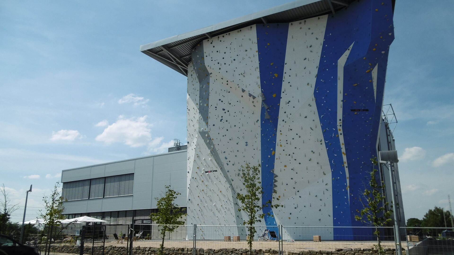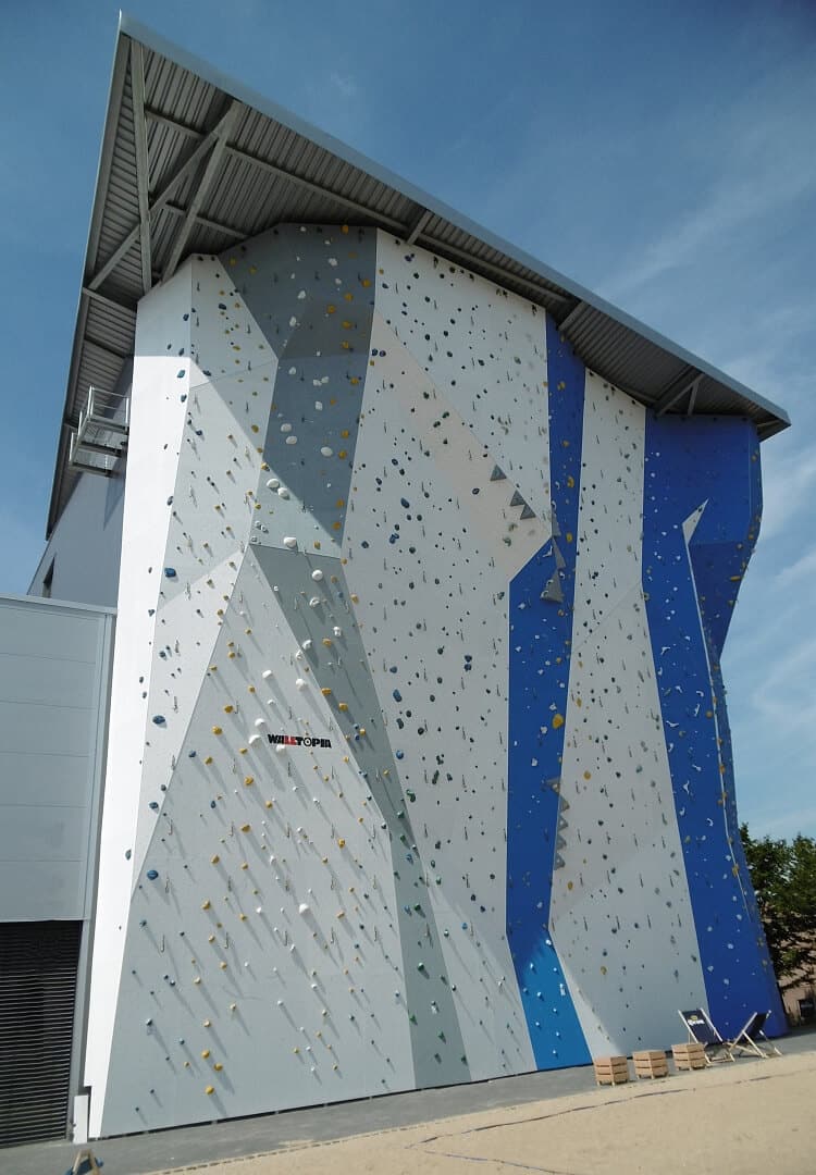 Seitenansicht der Bergstation Hilden – hohe Außenkletterwand mit Klettergriffen und Boulderbereich vor dem Gebäude.