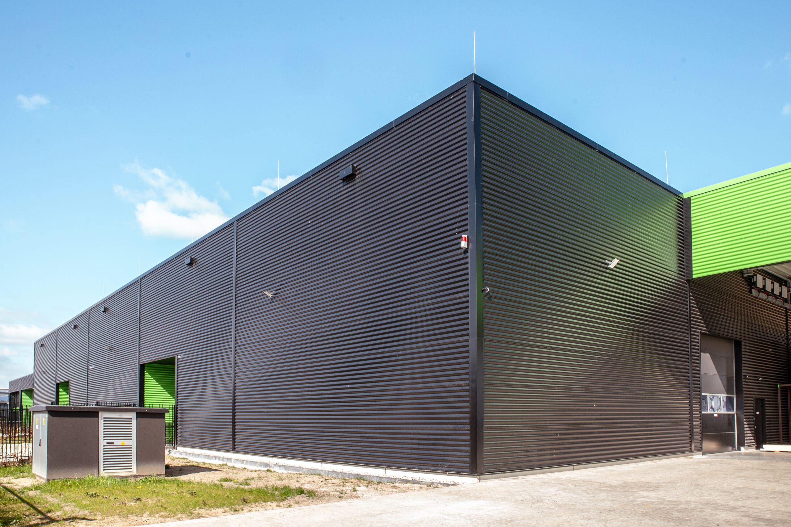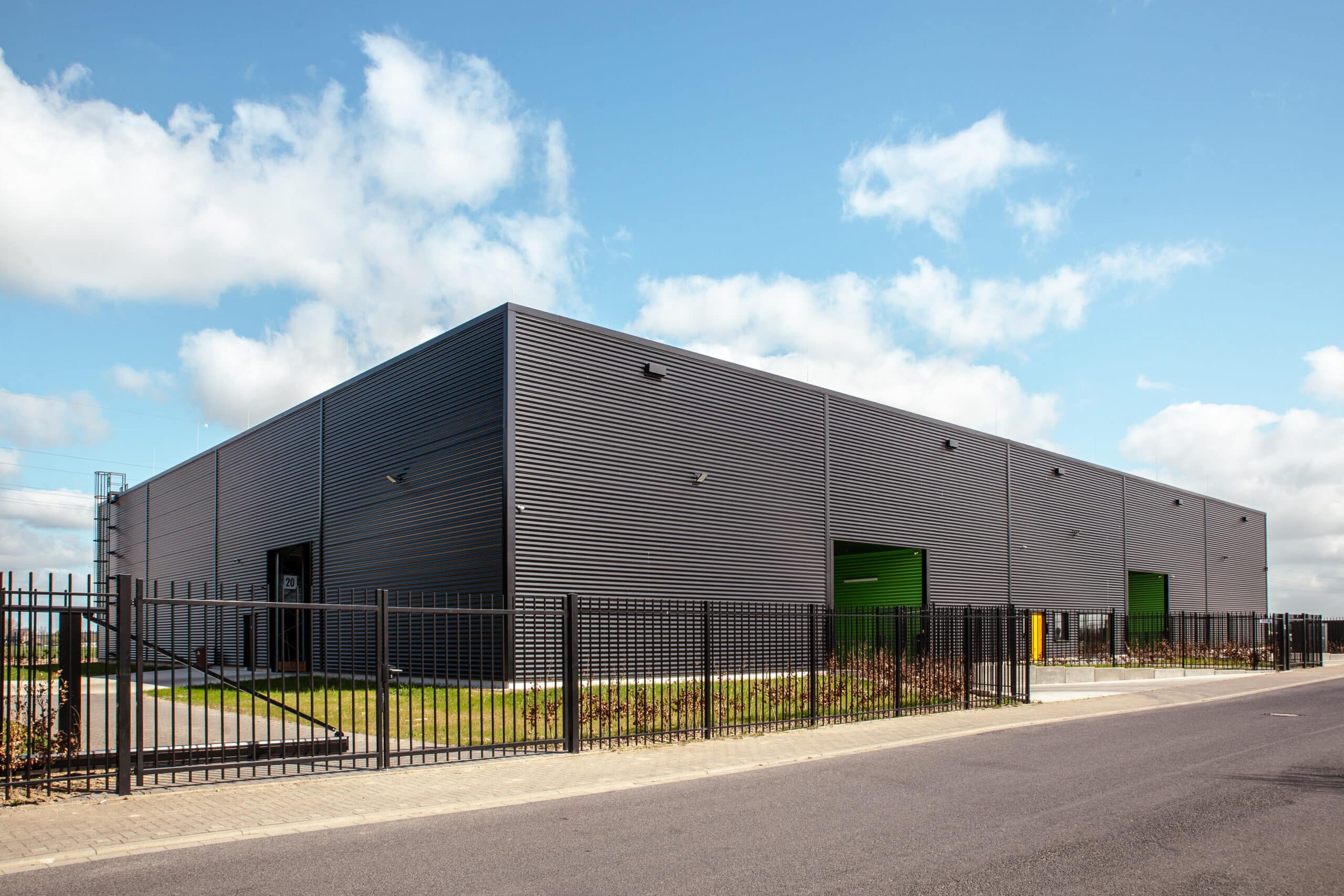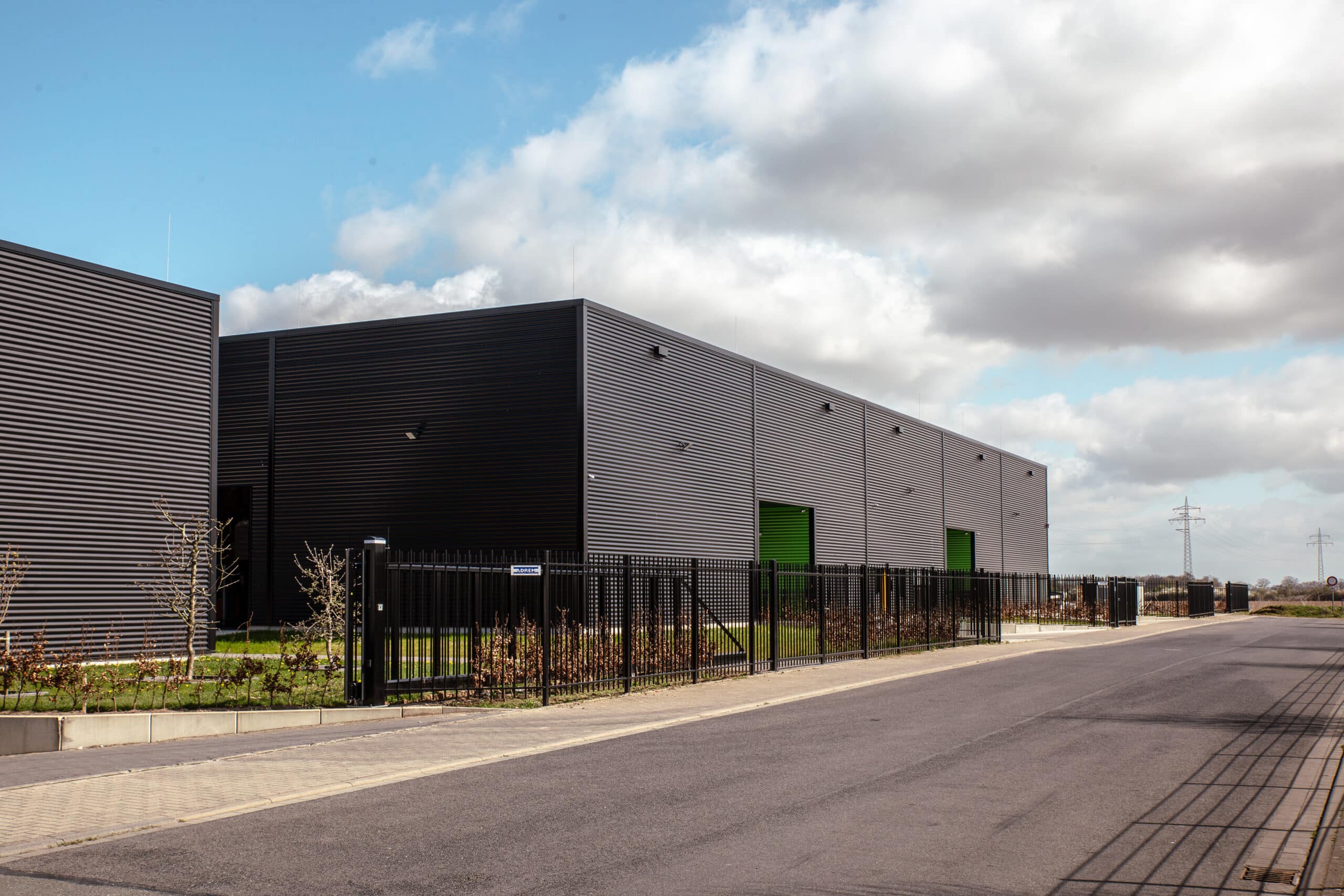 Betriebsgebäude mit schwarzer Metallfassade, eingezäuntem Außengelände und sichtbaren grünen Toröffnungen.