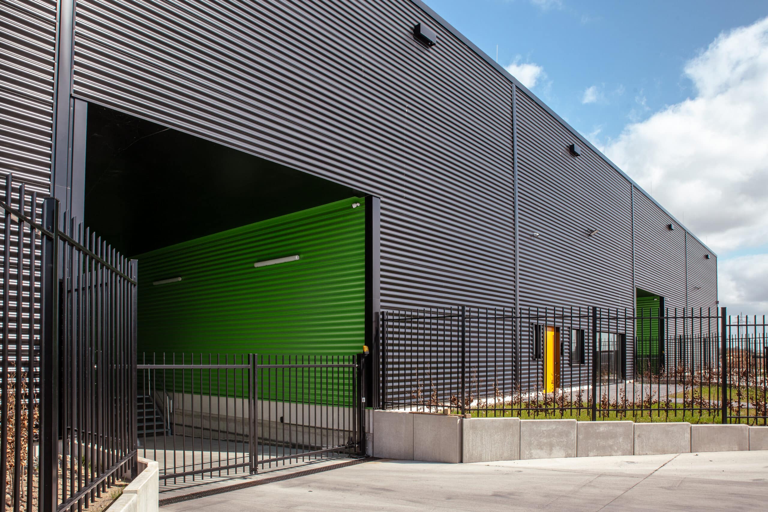 Die horizontale Wellenverkleidung über rund zwölf Meter verleiht dem Gebäude seine moderne, technische Anmutung. Das Farbkonzept in RAL 9005 Tiefschwarz kombiniert mit RAL 6018 Gelbgrün setzt markante Akzente und hebt Ladezonen sowie Funktionsbereiche deutlich hervor – ein Mix aus Wiedererkennungswert und praktischer Orientierung.
