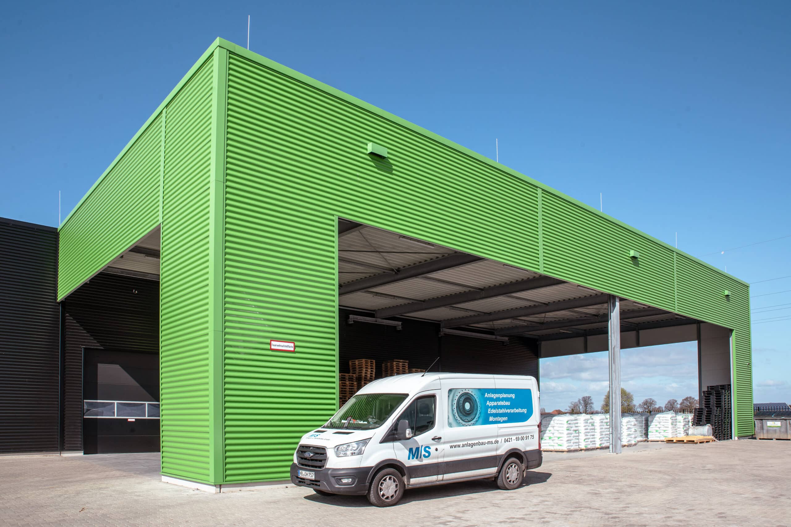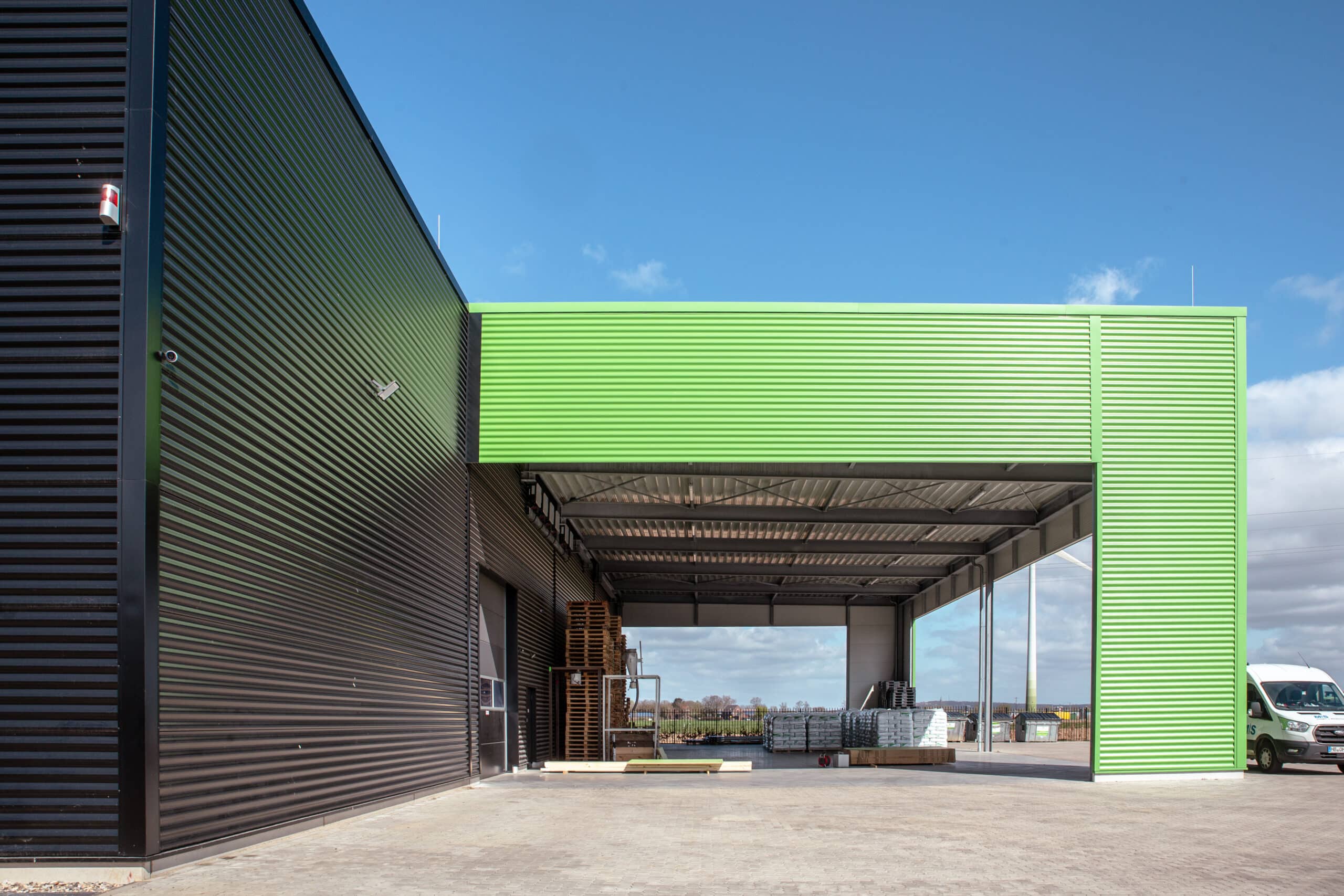 Überdachte Ladezone mit grüner Stahlverkleidung und Transporter im Außenbereich der Produktionsanlage.