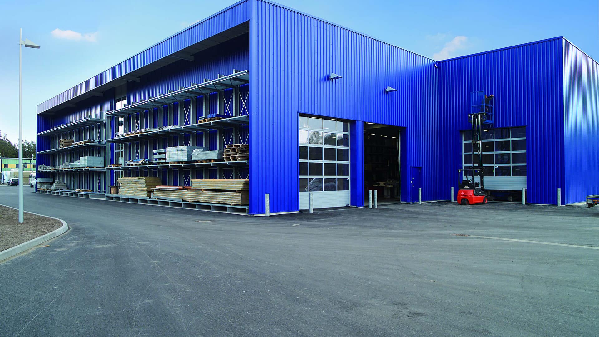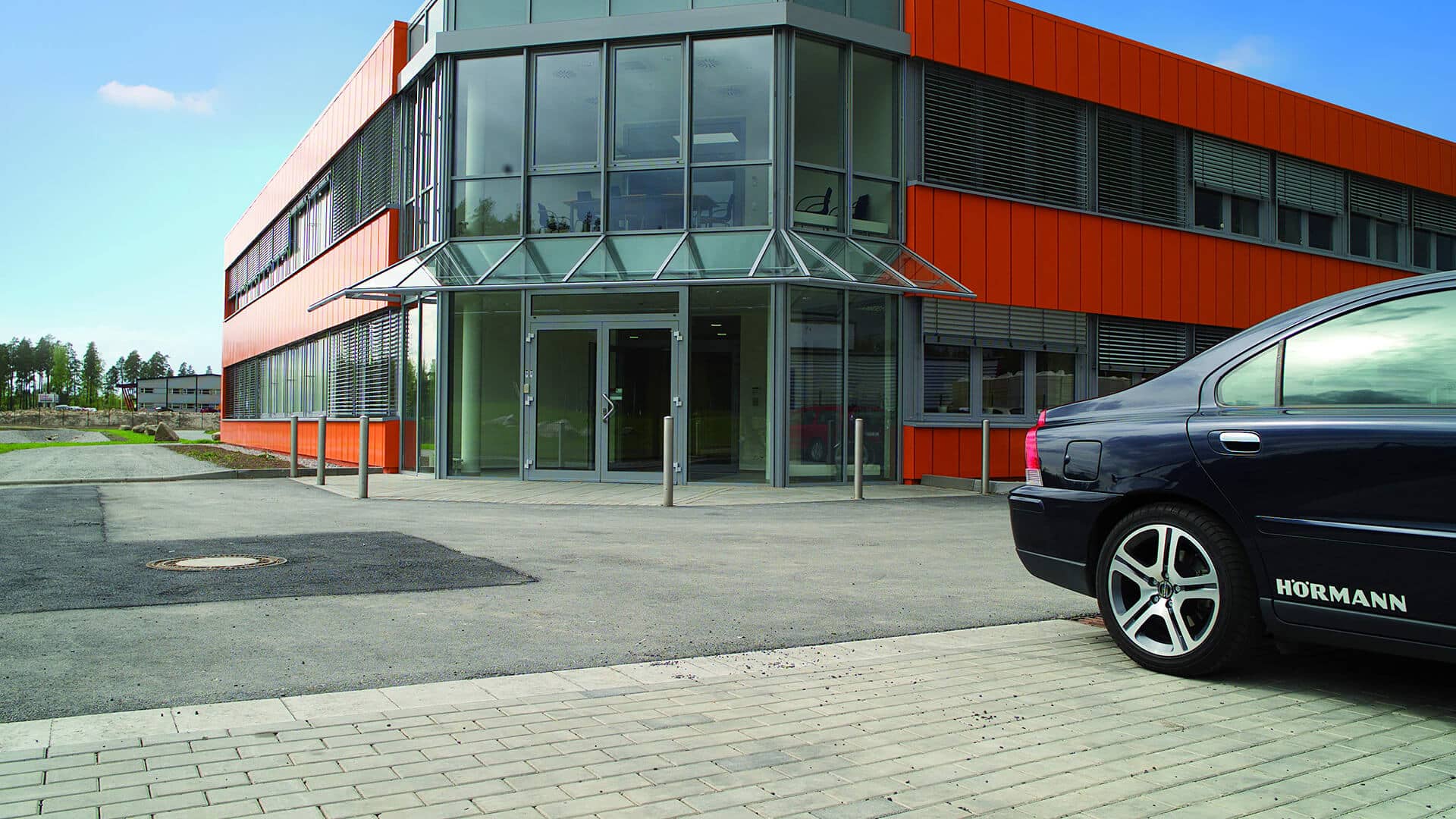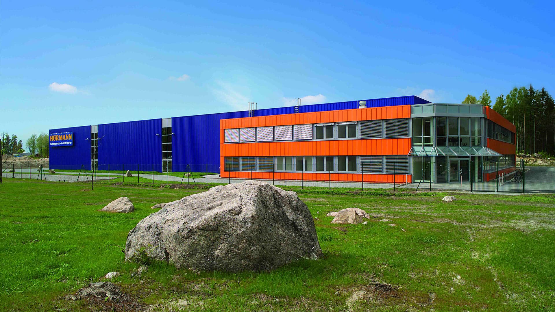 Am Standort in Schweden entstand eine funktional wie architektonisch überzeugende Gewerbebau-Lösung, die optimal auf die logistischen und organisatorischen Anforderungen von Hörmann abgestimmt ist. Das Gebäudeensemble besteht aus einer großvolumigen Lager- und Produktionshalle in Stahlbauweise sowie einem zweigeschossigen, direkt angebundenen Bürotrakt.